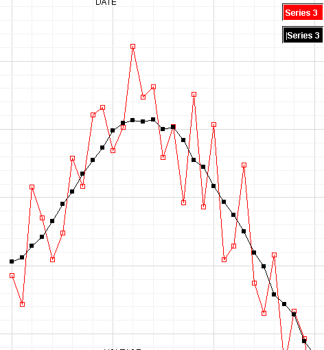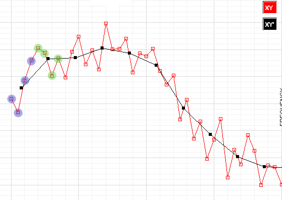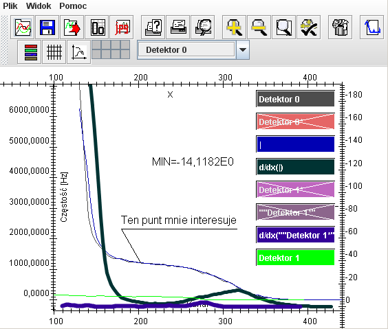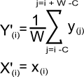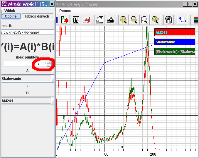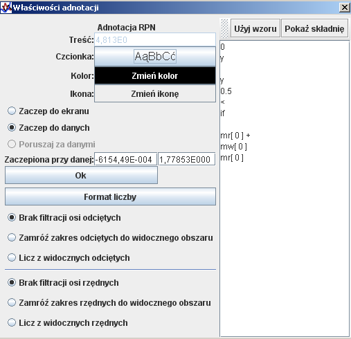 - kolejno dla wszystkich punktów danych (licząc wg. indeksu) należących do zakresu wykonywany jest podany wzór przy podstawieniu za X,A,B,C i D odciętych i rzędnych kolejnych punktów danych kolejnych serii wejściowych. Stos argumentów jest zerowany przy każdym przebiegu wzoru;